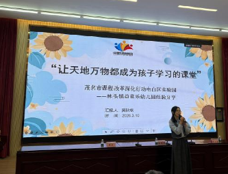 林头镇益童乐幼儿园吴秋蝶园长以《让天地万物都成为孩子学习的课堂》为题,分享乡镇民办园生活化、游戏化课程探索成果。秉持“儿童中心、自然连接、生长导向”理念,依托园内芒果、荔枝等本土果树资源,将自然、生活与课程深度融合,通过环创、生活实践等形式让幼儿亲身体验、自主探索。同时建立组织、教研、资源、迭代优化四维保障机制,联动家园社资源,践行生成教育,彰显民办园育人特色。