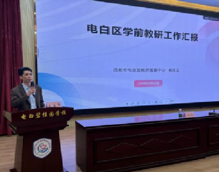 电白区学前教育教研员杨志文作全区学前教研工作汇报,从精神传达、工作复盘、问题查摆、任务部署四个方面,为新学期全区学前教研工作明晰方向、划定重点。